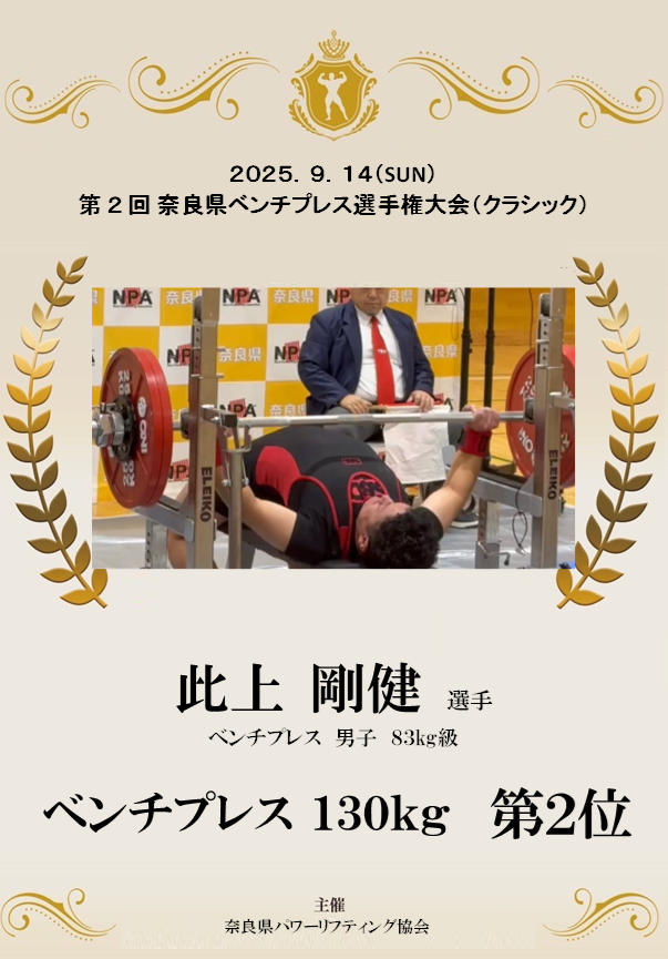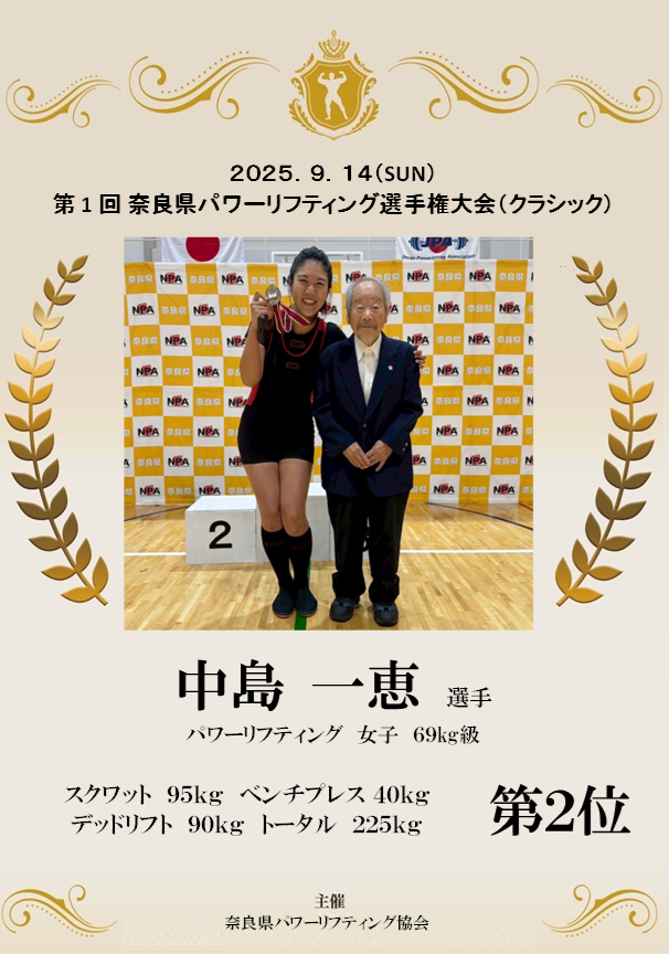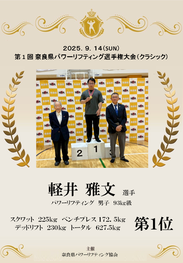 2025年9月14日(日)に開催された 第1回奈良県パワーリフティング選手権大会(エクイップ部門・クラシック部門) および 第2回奈良県ベンチプレス選手権大会(エクイップ部門・クラシック部門) にて、当ジム所属選手が好成績を収められました。